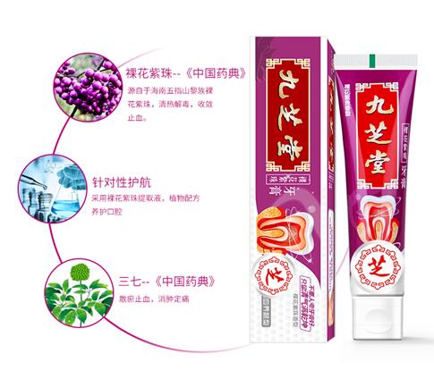 九芝堂博士后科研工作站结合10余年研发经验,瞄准裸花紫珠的药用价值,将其作为九芝堂牙膏的主打成分。目前,市面不乏中药功效的牙膏,也不乏强效清新口气的牙膏,但将二者结合的牙膏少之又少。据悉,九芝堂中药牙膏不仅添加了天然萃取的裸花紫株、铁皮石斛、三七等多种上乘中药材,而且采用了国际领先的EC180技术,达到中药功效与口气清新共存的效果,弥补了市面中药牙膏在此方面的不足。能够有效缓解口腔溃疡,减少牙菌斑,修复牙龈。