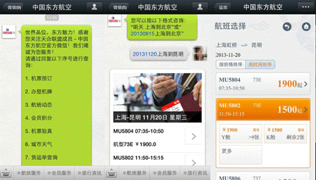 以机票预订为例,普通用户在添加中国东方航空的微信后即可自动接收快捷服务菜单,根据菜单输入相应指令,即可进入机票预订的流程。用户可直接在微信上完成从航线查询,航班选择等一系列自助流程,无需拨打电话或打开电脑登录网站。