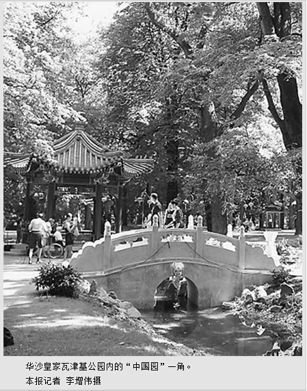 华沙皇家瓦津基公园博物馆馆长塔德乌什·杰尔涅维奇痴迷于中国古典园林和建筑艺术,他在接受本报记者采访时说,华沙皇家瓦津基公园是波兰人最喜爱的公园。18世纪下半叶,当时的波兰国王就在公园内修建了“中国园”,还将从这里通往夏宫的长约5公里道路命名为“中国大道”。随着此后波兰国家的衰落,“中国园”和“中国大道”也逐渐损毁和消失。2011年,在波兰总统科莫罗夫斯基的倡议下,由中波两国企业共同资助,先是重修了公园内长1100米的中国大道,现在又完成复建占地面积1.5公顷的“中国园”,华沙皇家瓦津基公园因此恢复了昔日的美丽容貌。