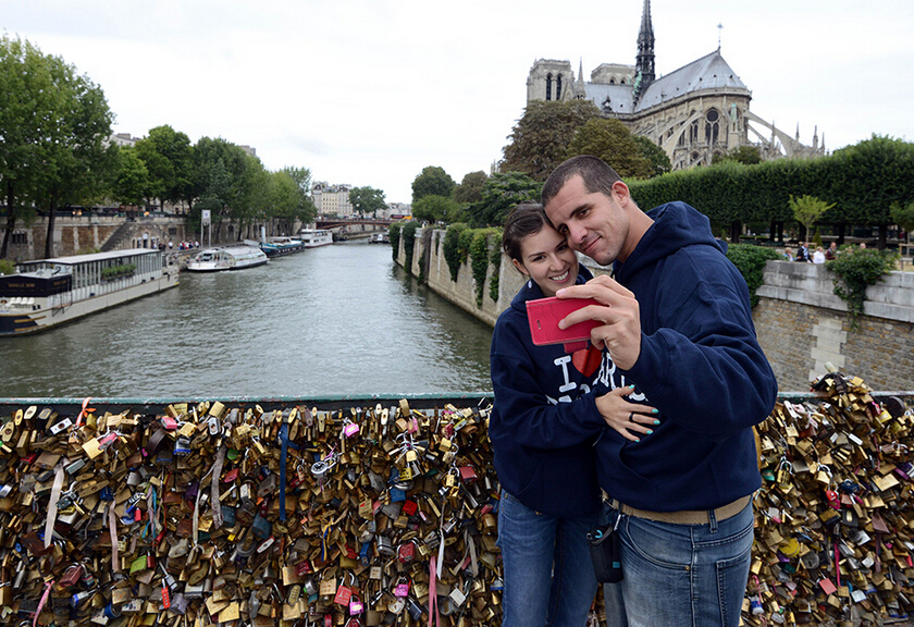 8月13日,在法国巴黎,一对墨西哥游客站在挂满爱情锁的主教桥上,以巴黎圣母院为背景自拍留念。