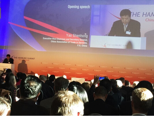 “汉堡峰会:中国与欧洲相遇”由汉堡商会发起主办,首届汉堡峰会始于2004年,每两年举行一次。中国服务贸易协会作为本次中国主办方,秘书长姚申洪率湖 南脉络草本咖啡、仁信智合保险经纪、金采科技集团、景森皮革制品、大华标高科技陶瓷、合肥彩信信息科技等国内优秀企业及多家行业协会代表参会,本次中国代 表团参会规模达到历届之最。