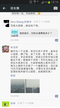 “我作为一个北漂,来京打拼十多年,虽有些小成就,赚了钱,买了大房,配了豪车,儿女双全,本应很幸福,但是北京的环境让我着实不爽!雾霾那个天啊!平时在微信上经常给大家发红包,大家都喊我土豪朱元帅!做(作)为土豪的今天做了一个重要决定:自己拿10万元发放雾霾补贴,只要在生活在雾霾笼罩的城市都可以领取,金额随机哦!”