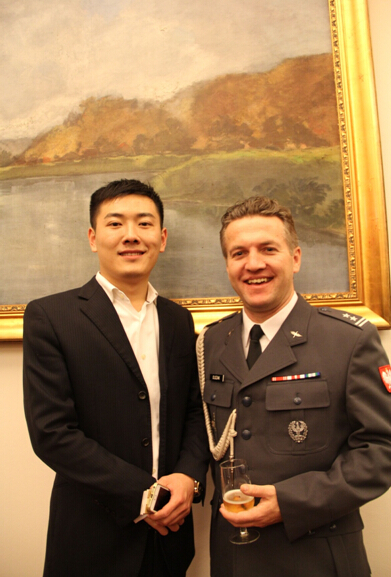 在晚宴上赵子航与波兰驻华武官在一起