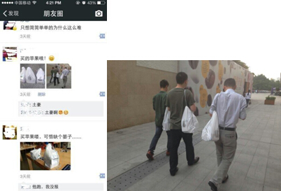 该公司的一位采购人员,也在其微信中晒出了当事购买iPhone 6的照片,并自嘲到“壕买手机,都是一袋子一袋子的,哥仨儿人手一兜儿“苹果”,咋还没有妹子上来要电话呢”