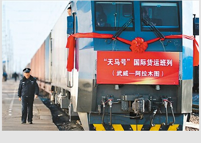 12月12日,中欧国际货运班列“天马号”从甘肃武威南车站出发,开始了前往哈萨克斯坦阿拉木图、全程约2646公里的首发行程。据了解,“天马号”未来将直达荷兰鹿特丹。图为“天马号”准备出发。
