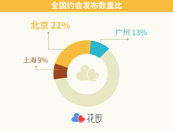 从整体数据来看,北上广这三座一线城市位于全国最喜爱约会城市的前三名,第一名北京发布约会数占发布总数的22%,广州占发布总数的13%,居于第二位,而上海相比于这两所城市则略显内向,约会发布数只占总数的9%。