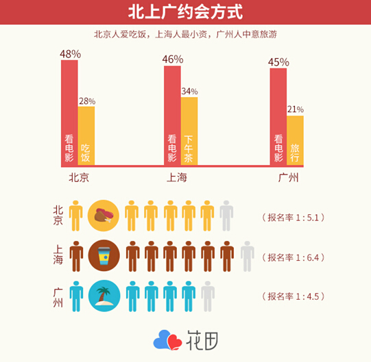 但是说到三地单身小青年们的第二选择,就大大不同了。在北京,吃饭的约会方式居于第二,有28%的人选择,报名比为5.1,也就是有一个人发布吃饭的约会信息,平均有5.1个人报名参加。而在上海,排名第二的是很有腔调的“咖啡和下午茶”,34%的上海青年们选择这一约会方式,同时,它的报名比也在6.4,也就是一条邀请下午茶的信息,平均有6.4个人报名参加。广州人的约会类型里,第二名则是旅行约会,占发布总数的21%,报名比则超过4.5。