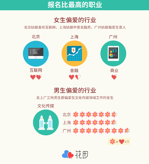 网易花田分析发现,在相同约会类型的条件下,男性的职业对约会的成功有着很大的影响,并且不同城市的女生最喜欢的男生职业并不相同。在北京,互联网行业的男生发布约会的报名比最高,为1.7,即平均每条约会有1.7个女生报名。在上海,则是金融行业男生的这一比例最高,为1.4,而广州比例最高的是商业,平均报名比为0.7。而在相同约会类型条件下,女生的职业对约会报名数也有一定影响,在文化传媒领域工作的女生发起的约会的报名比例最高,北上广三地分别为33.3,31.7以及42。