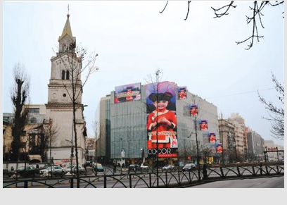 日前,罗马尼亚首都布加勒斯特市中心,科科尔商厦的电子屏幕上播出“欢乐春节”视频短片。科科尔商厦的电子屏幕由一块约40米高的主屏及数块小屏幕组成,是欧洲大陆最大的电子屏幕之一。“欢乐春节”视频短片定于春节期间每天7—24时播放,内容包括舞龙、福字、老者和女童拜年等镜头。