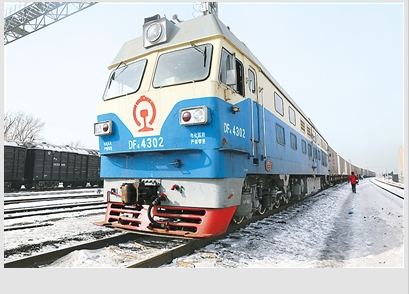 2月28日10时50分,一列满载石油勘探设备的集装箱货运班列在哈尔滨香坊火车站开出,10天后将到达俄罗斯中部比克良火车站。这标志着中国最北省份黑龙江省首趟中欧班列正式上线运营。图为首趟中欧班列在哈尔滨香坊火车站准备出发。