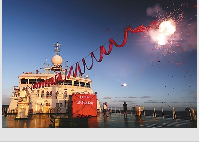 自2014年12月驶离青岛母港3个多月来,船员们克服海况和设备等诸多不利因素,完成了沉积物捕获器投放、地震数据采集、海底热流探测和岩石拖网等作业。图为3月6日,船员在“科学”号前甲板放鞭炮庆祝元宵节和科考任务完成。