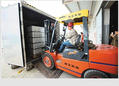 3月11日,由首趟“义新欧”中欧班列(义乌—马德里)运载的、从西班牙马德里至浙江义乌的首批返程货物,在义乌铁路海关监管场所完成通关手续。首批通关货物为一个集装箱货柜的共1.4万多瓶红酒。图为工作人员将首批通关的货物运出集装箱。