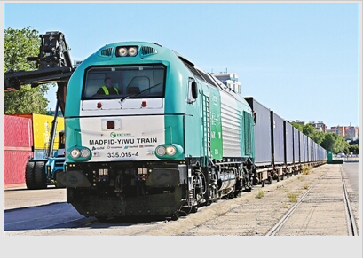 西班牙当地时间18日上午10时45分,“义新欧”(义乌—马德里)返程班列从西班牙首都马德里西南部的阿布罗尼迦尔铁路货运站徐徐开出,目的地是以小商品集散地闻名世界的中国东部城市——浙江义乌。图为“义新欧”班列驶离车站。