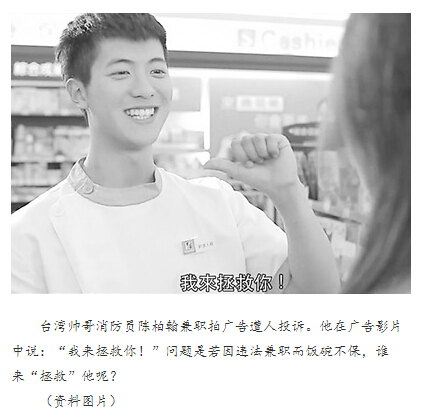 台湾桃园帅哥消防员陈柏翰因长相酷似明星吴尊,受邀成为综艺节目《康熙来了》的嘉宾,并被主持人小S评为“近半年来看过最帅的男生”。近来他接拍多条广告,频频曝光。在人气爆棚之际,烦心事也随之而来。有人投诉说,他身为公务员,兼职拍广告的行为涉嫌违法,严重的话可能饭碗不保。