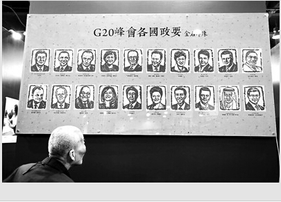 近日,为了迎接将在2016年在杭州召开的G20峰会,由国家非物质文化遗产“鸡血石雕”传承人钱高潮创作的G20峰会各国领导人肖像印现身杭州,各国领导人在印石上惟妙惟肖的表情十分引人关注。 图为杭州市民在观看G20峰会领导人的肖像印。