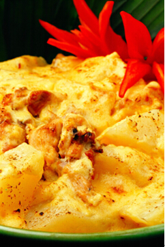 2.放鸡件炒香,加绍酒、高汤、椰汁、美国马铃薯薯角,煮20分钟。