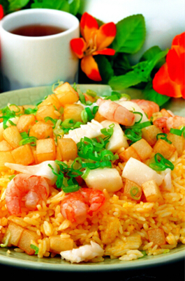 2.米饭炒香,加蛋、美国马铃薯薯粒和海鲜粒略炒。