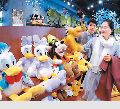 图为顾客在上海浦东陆家嘴的迪士尼商品官方旗舰店内挑选毛绒玩偶。