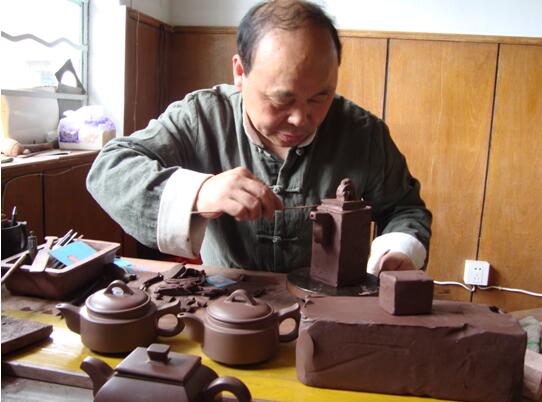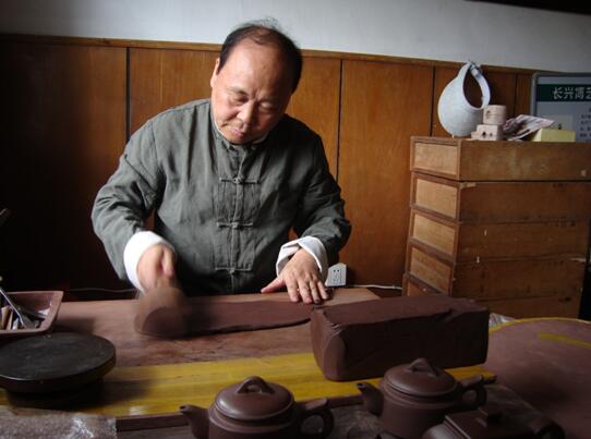 李静芷是个老紫砂艺人,也曾在其他制壶艺人的工作室做过,但这些年来一直在董建民紫砂工作室做。她这样介绍,董建民可谓是浙江长兴紫砂制作艺术的领军人物,1988年担任长兴紫砂厂厂长。在此期间,他竭力为长兴紫砂的发展创造出广阔的空间,那时的长兴紫砂产品也曾走出国门,远销海外,着实“火”了一把。特别是在1990年,经过董建民几个月独具匠心的精心设计、制作和烧制出来的巨型东坡壶《东坡提梁》,受到了同行和社会的高度称赞,该壶高2.8米、直径1.5米,成为了“壶”中的世界之最。其次,他制作的《中国印》紫砂壶,融合了董建民对中国传统文化及茶文化的独特理解,也凝结了他对紫砂壶艺术创新的不懈追求。该壶长14厘米、宽6厘米、高17厘米,近6000字的陆羽〈茶经〉以微刻的形式刻在了壶的正反面,每个字还不到一粒米的二分之一大,需要用放大镜才能看清,但每个字的线条、转折清晰可见,摸上去却光滑平整。此壶把传承与创新作为紫砂发展的最佳融合点,着重表达出了一种“壶”的精髓和一位“大工匝”几十年的紫砂情怀与娴熟的高超技法、技艺。2010年5 月,在浙江省(中国)第二届工艺美术精品博览会上荣获“天工艺苑杯”金奖。