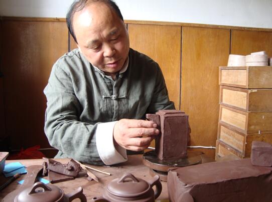 一直以来,就想亲眼目睹一下董建民的制壶风采。6月8日大早,董建民大师换了件专门的衣服,一眼看上去还真有那么一种制壶的“大匠”味儿。只见他刚坐定,随手从一个大缸里’掏”出一块紫砂泥来放在制作台上。很快,右手手法娴熟地拿起一个小木锤,在“泥”上敲了起来。不一会,紫砂泥“变”成了长长薄薄的一片,然后根据事先设计好的样片,用竹制“刀片”划分出一片一片来,随后就是切边、拼接、粘贴、围身筒、理身筒、装嘴等等一系列动作,据董建民介绍,一个紫砂壶毛坯的形成,至少要经过十多道工序。下午3点多钟,一个“中国印”的毛坯紫砂方壶就诞生了。