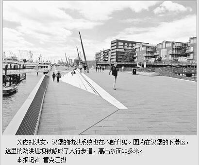 从上世纪90年代起,汉堡沿着河道用不锈钢板筑起了防洪门、防洪墙。汉堡路桥局负责水利防汛的专家奥拉夫·穆勒博士对本报记者说,这种抗洪钢板造价不菲,每千米需耗资500万欧元。