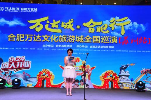 “万达城,合肥行”全国巡演来到苏州,合肥市旅游局市场处曹蓉主任、合肥市旅游局信息中心主任吴学年、合肥万达文化旅游管理公司营销总经理张亚峰、安徽万达环球旅行社副总经理郝蕊、苏州市旅游局副局长徐伟荣、苏州市旅游协会会长丁海洋等出席本次活动并致辞。多家省市级新闻媒体以及当地网络达人等前来报道,万达广场上人山人海,聚集了热情好客的苏州人民,共同见证苏州站巡演活动盛况。