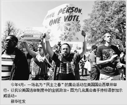 美国副总统拜登认为,党争与政治僵局不仅在国会内部一再上演,其“溢出效应”甚至不断威胁美国“三权分立”的基石,造成联邦政府权力不断失衡。金钱政治无解,政治僵局难消,都促使美国民众走上街头,登上国会大厦的台阶呼唤“民主之春”。