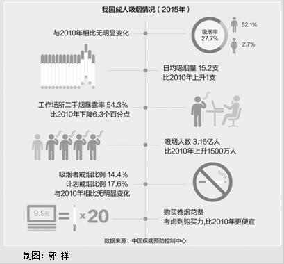 2006年世界卫生组织《烟草控制框架公约》在中国生效,至今已整整10年。按照承诺,中国本应于5年前实现室内公共场所全面无烟,并禁止所有烟草广告、促销和赞助。然而,《公共场所控制吸烟条例》至今尚未出台。《2015中国成人烟草调查报告》显示,我国成年(18岁以上)吸烟者高达3.16亿,吸烟率没有变化,吸烟人数增加了1500万。