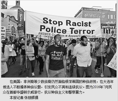 今年,种族问题是美国两党总统候选人交锋的重点之一。共和党总统候选人特朗普为拉白人选票,抛出的种族主义言论造成新的不安,加剧了排外情绪。民主党总统候选人希拉里指责特朗普偏执,但民主党继续推进“平权运动”可能引起新的不满。美国种族关系更为剑拔弩张,种族问题痼疾更为严重。