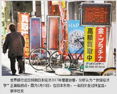 世界银行近日发布预测,日本经济2017年将增长0.9%,相比2016年的1.0%有所减速。消费税率推迟上调及经济刺激措施的效果值得期待,但人口减少和老龄化将拖累经济增长。2016年日本经济原地踏步。国际货币基金组织(IMF)去年8月公布的日本经济年度审查报告称,经济增长、整顿财政、物价上涨的目标都没有如期实现,推迟消费税增税等政策不明朗情况加剧。报告认为,日本政府的经济刺激政策——“安倍经济学”正面临拐点,迫切需要改良。