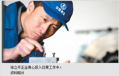 由于固体火药有很强的韧性,含有粗糙的颗粒,用刀的力道很难把握,一刀切下去,药面很难保持平整,一旦切多或者留下刀痕,药面精度与设计不符,火药就不能按照预定走向燃烧,导致发动机偏离轨道,甚至爆炸。药面平不平,每次用刀切多少,都靠技能人员自己判断。为了练好手上功夫,徐立平就不停地琢磨和练习怎么用力、怎么下刀,比划着切、削、铲等基本功,揣摩着刀具切削量、切削角度、切削力度,手臂酸痛还不放下,上岗操作时更是一丝不苟,虚心请教,一刀一刀地勤学苦练,多年下来练坏了30多把刀具,手却越来越有感觉,药面整度也越来越高。到后来,用手摸一下,他就知道如何修整出符合设计要求的药面,经过他整形的产品保持了100%的合格率。