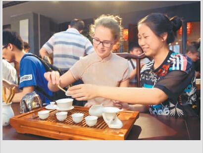 日前,德国马尔巴赫市席勒中学、安徽省铜陵市一中的高中生,在安徽民俗村共同学习中国茶道艺术。学习期间,中德两国青年了解了中国茶文化起源、从茶的祭祀品到药品再到民间饮品的过程,并在现场观看茶艺表演。