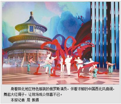 身着陕北地区特色服装,伴着浓郁的中国西北风曲调,大红绸子舞起来——俄罗斯演员表演的《中国彩带舞》让现场观众惊喜不已。这是俄罗斯国立莫伊谢耶夫模范民族舞蹈团的保留节目,上世纪50年代就在天安门广场表演过,及至今天,这个节目依然在俄罗斯以及世界各地的巡演中经常上演,每每赢得热烈掌声。