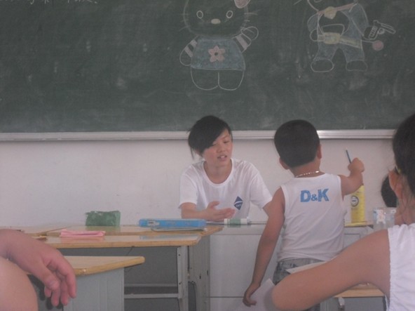 奚靖是这个班级的英语老师,他是个二十一岁的大男孩,但他就像个母亲一样细心的教导着每个孩子,无论孩子有多么的顽皮,他都会用他那最宽广的心包容他们,并耐心的教导他们。潘孝伦是班级里最顽皮的孩子,当同学们都在上课时他却一个人跑到教室外面,时不时的顶撞老师,还经常一个人跑到操场挑逗小狗。在多次请来家长后,所有的教师都放弃了这个孩子,奚靖却没有放弃他,他努力地沟通家长,尽量多可能的了解这个孩子,他很细心很有耐心的辅导着,努力模仿潘孝伦他母亲的口吻和他交谈,终于在他的努力下这个孩子慢慢的懂事起来。随着时间的推进,低年级的孩子们可以念出二十六个字母了,孩子们的活跃度也越来越高,他们慢慢的喜欢上了英语。当潘孝伦也能默写出二十六个字母时,奚靖的泪水不禁的涌了出来。潘孝伦的妈妈在最后一次接孩子放学时,很激动的对我们说“在这里的这些天,孝伦懂事了很多,多亏了你们耐心的教他,真的是太谢谢你们了”。听到这样的话,队员们最感到欣慰。