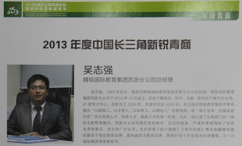 2013年11月17日,在由共青团江苏省委、共青团上海市委、共青团浙江省委、江苏省侨联指导主办的“2013年中国长三角青商论坛暨海内外杰出青商嘉年华”活动当中,精锐国际教育集团苏浙区总经理吴志强老师当选“2013年度中国长三角新锐青商”!