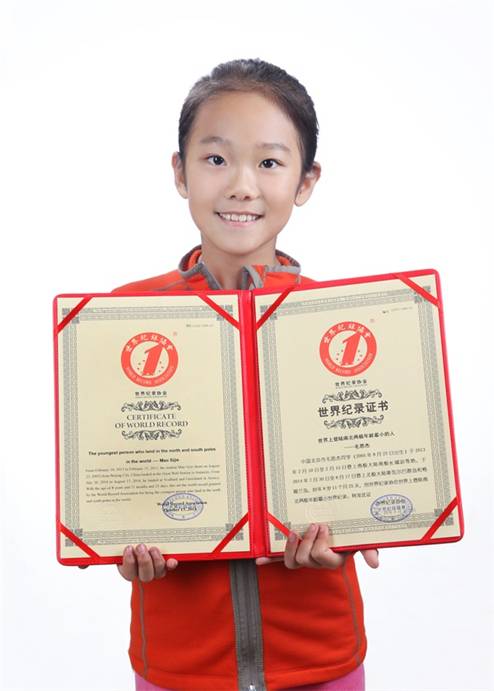 来自北京的毛荣荣小朋友于2013年2月10日至2月15日登陆南极洲,访问了中国南极长城站、英国南极科考站等地,时年7岁5个月,创造了“世界上登陆南极年龄最小的人”世界纪录。今年,毛荣荣小朋友再赴北极探险,于2014年7月30日至8月14日期间,登上北极斯瓦尔巴群岛和格陵兰岛,时年8岁11个月。经世界纪录协会认定,毛荣荣小朋友创造了“世界上登陆南北两极年龄最小的人”世界纪录。