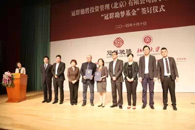 在今年10月10日,由北京大学与冠群驰骋联合成立“冠群助梦基金”。“冠群助梦基金”倡导学子不断提高综合素质,拓展交流与实践,增强社会责任感,从身边点滴做起,用自己的知识帮助身边需要帮助的人,真正做到“学以致用,知行合一”。同时,由北大授牌,冠群驰骋正式成立“北京大学学生服务总队能力建设基地”,每年帮助北大学子开展能力建设活动。