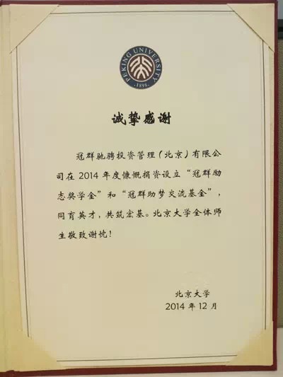 信中写到:冠群驰骋投资管理(北京)有限公司在2014年度慷慨捐资设立“冠群助梦励志奖学金”和“冠群助梦交流基金”,共育英才,共筑宏基。北京大学全体师生敬致谢忱!