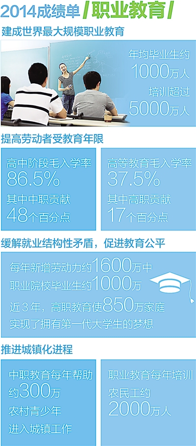 目前,中国特色现代职业教育发展道路初步形成,服务经济社会发展和人的全面发展的能力大幅提升。2014年,全国共有职业院校1.33万所,年招生966.83万人,在校生2809.53万人。“十二五”以来,职业院校共培养近5000万毕业生。近年来一些热门行业新增从业人员中,职业院校毕业生占70%以上。