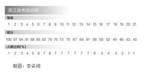 浙江省的选考科目采取“赋分制”的计分方式:成绩按等级赋分,以当次高中学考合格成绩为赋分前提,高中学考不合格不赋分,起点赋分40分,满分100分,共分21个等级,每个等级分差为3分,不同等级的人数比例不同,整个分数分配呈现两端小、中间大的橄榄形。(详见图表)