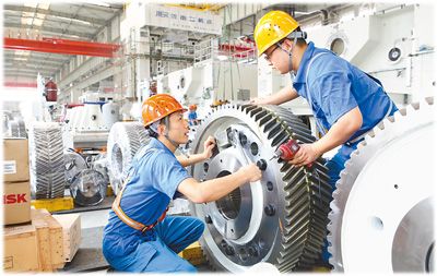 济南二机床集团师傅孙壮(左)正在给徒弟马林示范,预紧中间传动齿轮轮毂紧固螺栓。