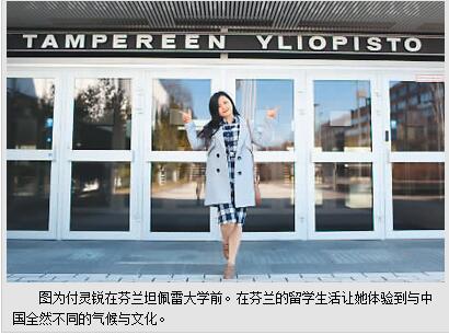 安全、安逸也是付灵锐对芬兰的印象,留学经历让她渐渐地爱上了这个国家。“我特别喜欢芬兰的社会环境,高福利、低贫富差距,社会安定。人们生活简单悠闲,汽车永远礼让行人,手机钱包即使遗落也不会被人捡走。超高的森林覆盖率,纯净的湖水,彩色的湖边小别墅,这些都是芬兰人最普通的生活,在我看来,就像童话一般。”
