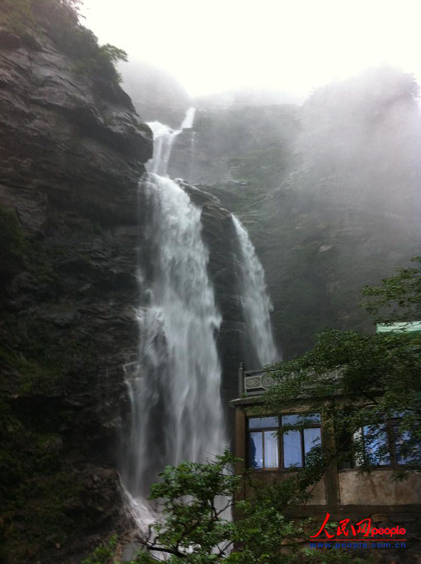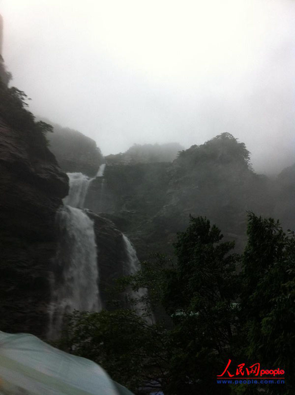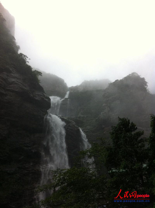 “不到三叠泉,不算到庐山”。通常人们见到的三叠泉大多是涓涓细流。6月27日整天大雨,28日人民网记者来到三叠泉,但见高山深处迷雾中奔涌的山泉飞流直下,好一个新的“飞流直下三千尺,疑是银河落九天”的壮观景象展现在眼前,宛如人间仙境,说不尽的诗情画意,游客大呼:“壮哉!壮哉!”。