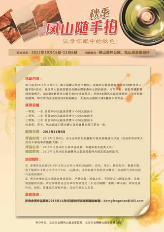 即日起至2013年11月6日,北京市民前往金隅蟒山国家森林公园,用手机相机拍摄照片,再将拍摄的作品@金隅温泉度假村 、发送到bbmgfengshan@163.com邮箱即可参加#凤山随手拍#活动。并且所有作品都将纳入的秋染蟒山,大美凤山“摄影大赛作为业余组参赛的作品,优胜者可获得丰厚奖品。