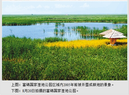 富锦国家湿地公园位于黑龙江省富锦市西南,2009年晋升为国家湿地公园。上世纪90年代,现湿地公园所处地域的大片湿地被开垦成耕地。从2005年至今,富锦市开展退耕还湿行动,被开垦的湿地全部退耕。目前,湿地恢复后的园区内原生态系统保持完好,成为退耕还湿的成功范例。