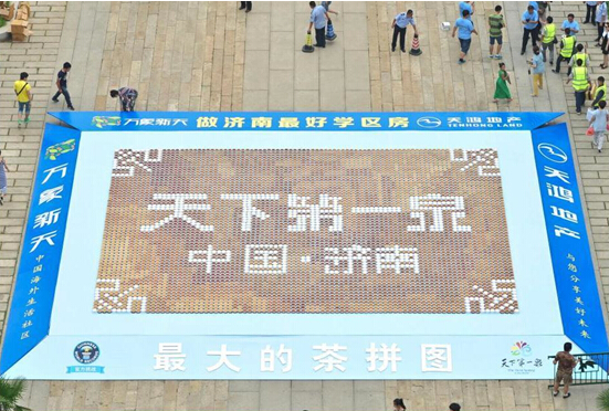 8月30号上午,济南天下第一泉风景区大明湖畔,工作人员用5280碗大碗茶完成“最大茶拼图”,成功挑战吉尼斯世界纪录。拼图面积约86.5平方米,整个图案由5280碗红茶或白茶按规则摆放,茶拼图上可见“天下第一泉--中国济南”的字样。