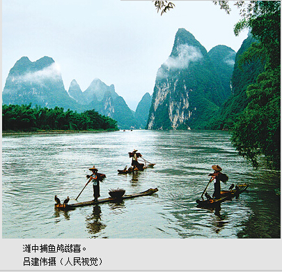 渔村,距集镇约2公里,只通水路。船行漓江上,水环峰转,碧波倒影,山水含情,船在水上走,人在画中游。“江作青罗带,山如碧玉簪”,“分明看见青山顶,船在青峰顶上行”——诗言妙处,只有身到此间,才能真真体味。九马画山、黄布倒影、鲤鱼挂壁……美景无处不有,无时不在。导游说,兴坪耐看,晴时的奇峰倒影,雨时的烟波浩渺,阴天的漫山云雾,各擅胜场,不负游人。