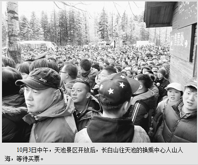 由于下雨和积雪,多日未开的天池当日中午开放。几天的游客聚到一起涌向换乘中心,且不说抢乘交通车的那般情景,就等着购买去天池的倒站车票的队伍头尾都分不清,现场黑压压一片。由于只有一个购票处,加上应对措施明显不足,未切实分隔人流和组织临时排队售票等,导致人挤人、人贴人,插队的、横挤的,人流像波浪一样打起秋千,让人十分担心,不少人退出或被挤出而不得不先游其它景点。