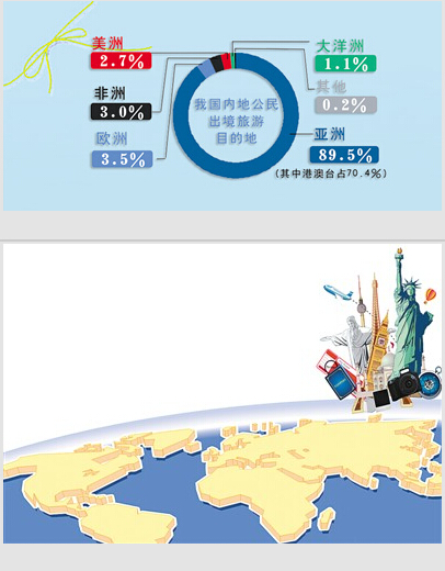 统计表明:我国内地公民出境旅游目的地的分布为亚洲占89.5%,其中港澳台占70.4%;欧洲占3.5%;非洲占3.0%;美洲占2.7%;大洋洲占1.1%;其他占0.2%。我国内地公民出境旅游超过百万人次的目的地国家有韩国、泰国、日本、美国、越南和新加坡六国。今年赴韩国、日本游客增幅最大,均超过40%。