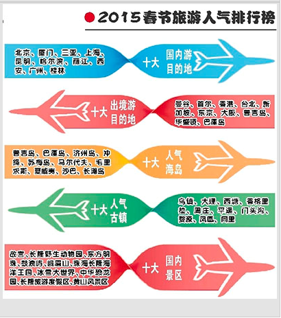 旅游已是百姓日常生活的重要组成部分,今年春节旅游消费依然强劲。中国旅游研究院近日联合携程旅行网,结合超过2.5亿用户群体数据,对今年春节假期的旅游情况和游客行为进行了全面监测,发布了2015春节旅游人气排行榜和相关分析报告。